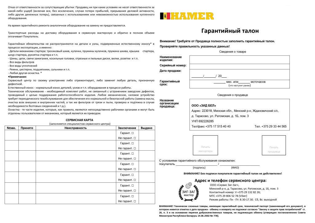 - Ремонт, диагностика, текущие ТО, гарантийное обслуживание производится исключительно в пределах РБ, в мастерских производителей и/или в сервисе продавца.